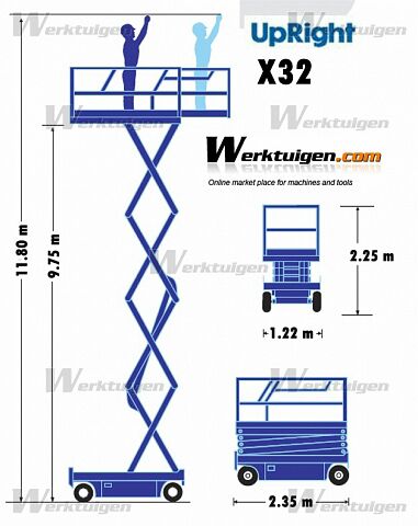 Электрический ножничный подъёмник Upright X32 - рабочая высота 12 метров, максимальная высота платформы - 10 м, грузоподъемность -340 кг, горизонтальный вылет платформы -1 м, размер платформы -1.12 м х 3.2 м, (Ширина С, высота D, длина Е - 1.22 м х2.32 м х2.35 м), вес- 2483 кг, Источник питания -24Вт, 4 х 6V220 Ач. Компактная модель на электрическом приводе (аккумуляторе) предназначена для выполнения внутренних отделочных, монтажных и других работ в различных помещениях.Бесшумный, отсутствие выхлопов, не пачкающие пол покрышки, полная автономность в течение 10 часов. Мобильность подъемника позволяет ему самостоятельно передвигаться в зоне производимых работ.
